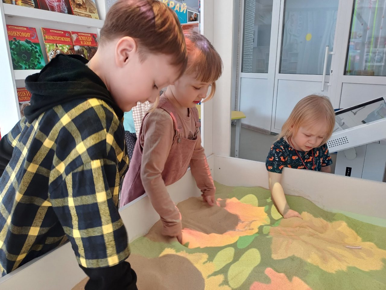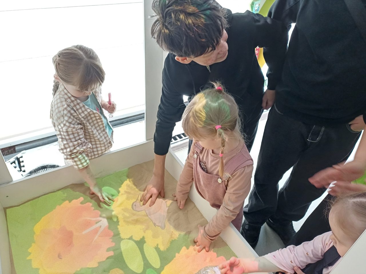 Вместо бумаги и карандашей – интерактивный песок. Мягкий, сыпучий, послушный. Ребята рисовали на световых столах силуэты птиц, а затем «разукрашивали» их – добавляли пёрышки, хвостики, клювики. Песок позволял быстро менять рисунок, исправлять детали и пробовать снова и снова.